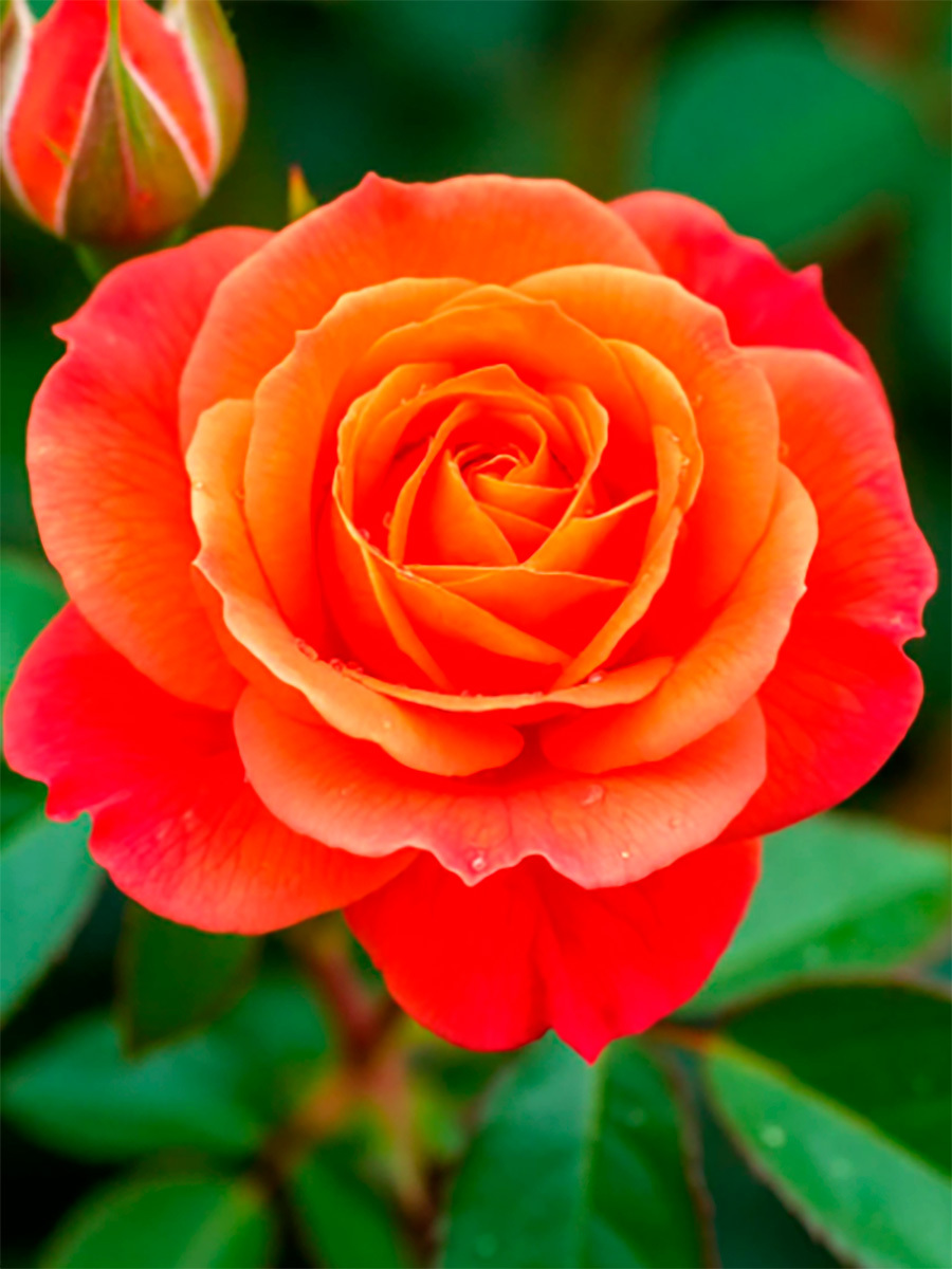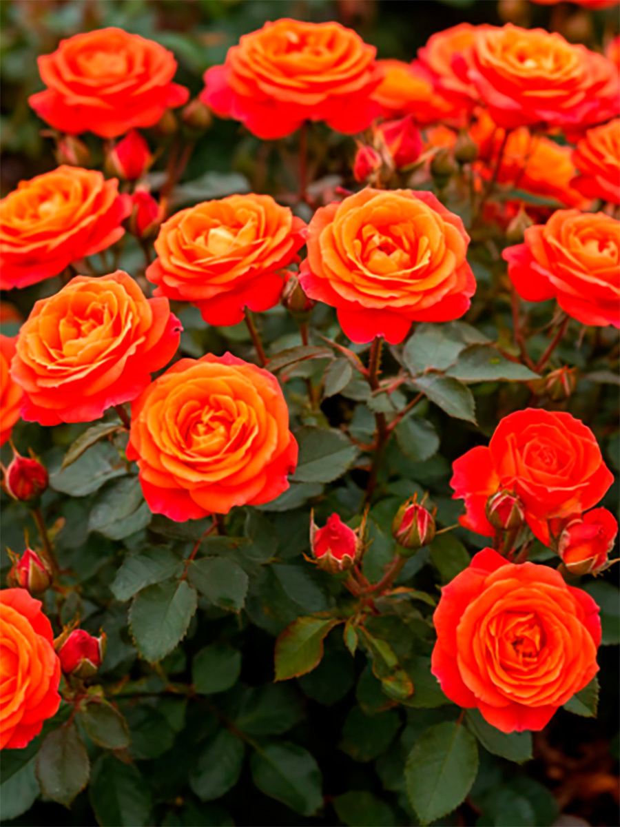 Роза миниатюрная Оранж Джувел (Orange Juwel): Миниатюрная (карликовая, бордюрная) роза. Выведена в Германии, год интродукции — 1987. Куст: слегка раскидистый, высотой 30–50 см, шириной 30–40 см. Листья: тёмно-зелёные, блестящие, кожистые. Цветки: ярко-оранжево-красные, чашевидные, с рыхлым расположением заострённых лепестков, густомахровые (26–40 лепестков). В полном роспуске показывают серединку с жёлтыми тычинками. Цветёт: обильно, почти непрерывно с июля по сентябрь. Аромат: слабый и ненавязчивый.