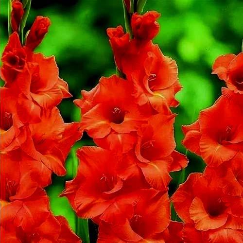 Гладиолус Wig's Sensation (Вигс Сенсейшн) - чистый оранжево-красный оттенок лепестков словно горит на солнце настоящим огнем. Особенно эффектно смотрятся такие гладиолусы, высаженные группой по 8 или 10 штук на изумрудном газоне. Высота растения ограничена 1 метром, длина колоса составляет 60 сантиметров. На цветоносе плотно расположены от 12 до 14 цветков, каждый до 17 сантиметров в диаметре. Лепестки с ровным краем, на каждом имеется едва заметный белый штрих, что не портит впечатление от пламенного оттенка бутона.
