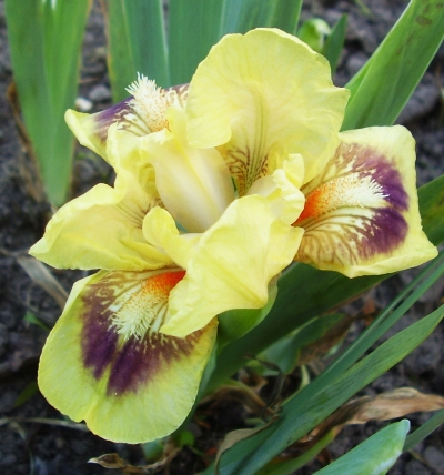 Высота - 25 см. Ароматный, желтый цветок с красным пятном на бородке.