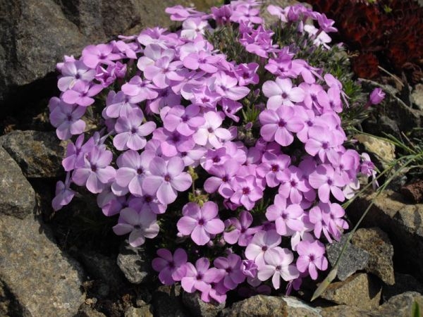 Флокс Дугласа представлен низкорослыми травянистыми растениями высотой до 10 см. Вид относят к почвокровным стелющимся культурам. В процессе роста растение формирует компактные, густо-облиственные, карликовые подушечки округлой формы. Стебли плотные, распростертые. Листва жесткая, темно-зеленая, шиловидная, длиной не более 1-1,5 см. Цветки некрупные, сидячие, светло-лиловые, темно-пурпурные, пурпурные, белые, фиолетовые, лавандово-голубые, темно-красные, розовые или карминно-красные, собраны в головчатые соцветия по 1-3 штуки. Цветки могут быть оснащены более темным или другого оттенка глазком. Цветет флокс Дугласа в конце мая – начале июня, часто наблюдается повторное цветение в августе. Цветение обильное. Сорт представлен растениями с нежно-сиреневыми цветками. Пригоден для миксбордеров, альпийских горок и других типов цветников.