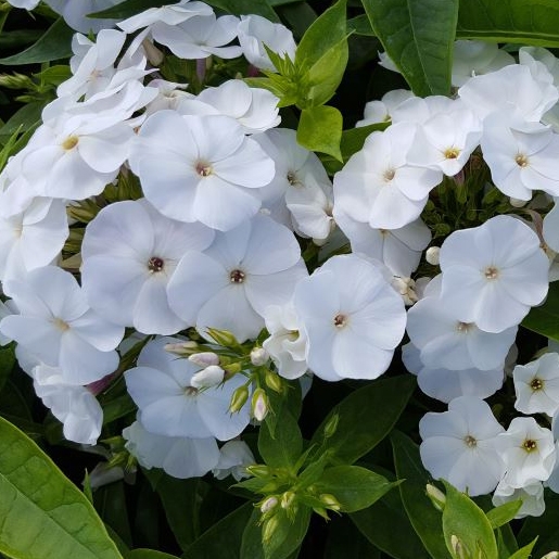 Цветок колесовидной формы, белоснежные лепестки с тонким золотисто-желтым колечком в центре. Соцветие среднего размера, плотное, эффектное. Куст прочный, мощный, быстро разрастается, устойчивый к заболеваниям. Цветение обильное и продолжительное. Флокс Zoë (Зои) - украшение любого цветника!