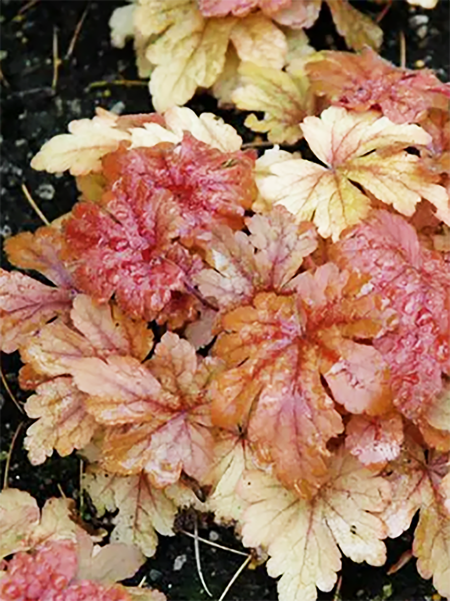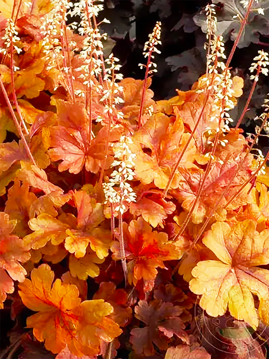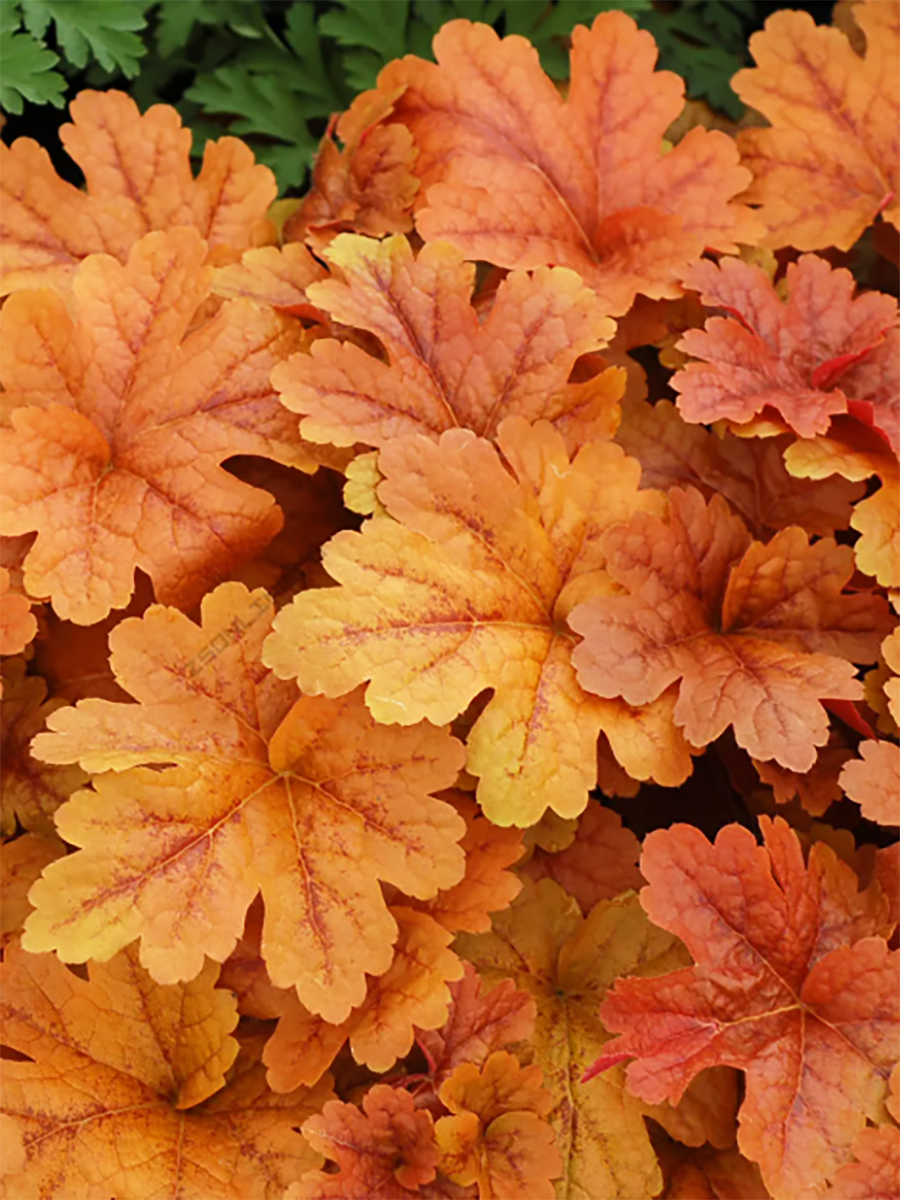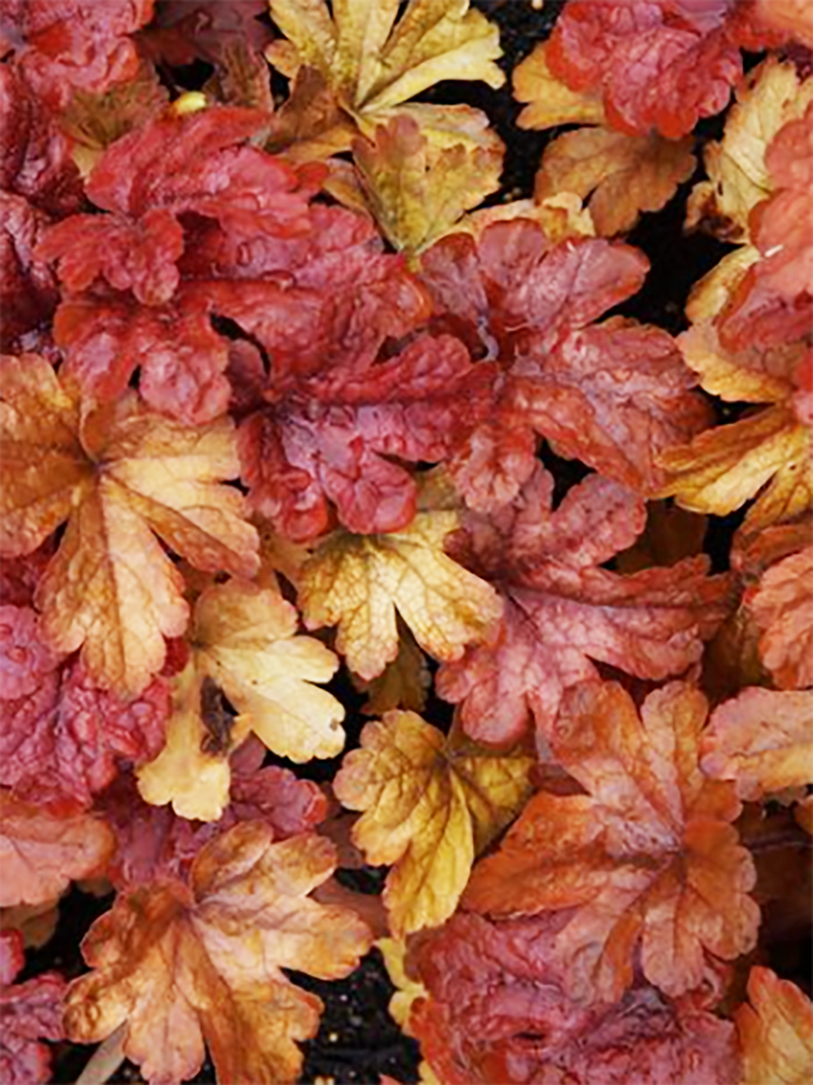 Компактный, низкий, вечнозелёный куст, образованный прикорневой листовой розеткой. Листья сочного, карамельно-оранжевого и медного цвета, по форме напоминают кленовые. Осенью цвет листьев меняется на розово-красный и бордовый