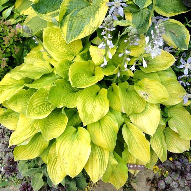 Листья округло-сердцевидные, чашевидные, жатые, зеленовато-желтые весной и желтые летом. Цветок крупный, колокольчатый, от нежно-лавандового до почти белого цвета. Листовая пластинка плотная, матовая. Одним из хороших качеств хосты August Moon (Аугуст Мун) является устойчивость к солнцу.
