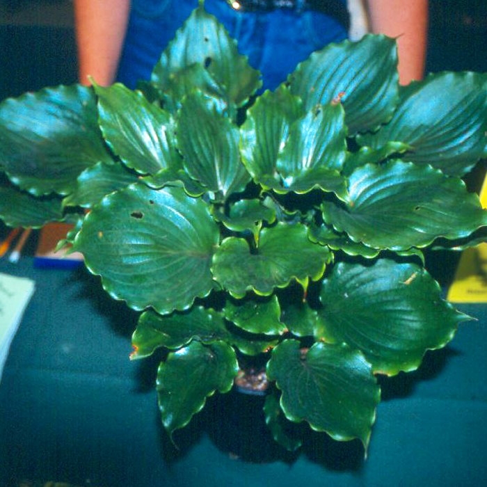 Средняя хоста. Листья сердцевидные, очень толстые, блестящие, с глубоким жилкованием, тёмно-зелёные с изумительной гофрировкой по краю. Цветы лавандовые.