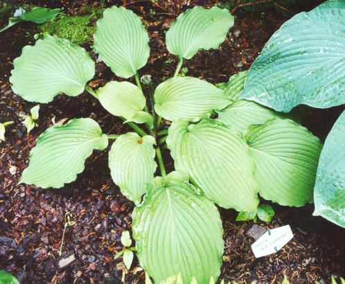 Большая хоста с зелеными листьями с ярко выраженным жилкованием, край переходит в красивую оборочку. Величественная и красивая. Рост умеренный.