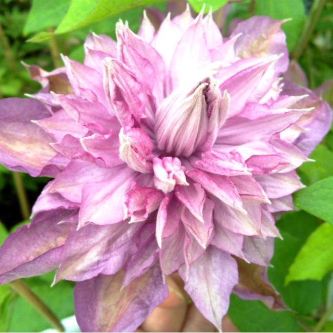 Клематис гибридный Proteus (Протеус) умереннорастущий, вьющийся сорт с махровыми розово-лиловыми цветками, количество которых на одном побеге может достигать сотни, высотой до 2,5 м. Цепляется за опоры усами. У клематиса Протеус листва густая зеленая. Бутоны располагаются по всей длине лианы. Цветки на побегах этого года летом одиночные, обильные на прошлогодних побегах. Густомахровый цветок этого сорта клематиса в диаметре достигает 14-18 см. Чашелистики объёмные у основания, сильно текстурированные ближе к центру, становятся тоньше к концу, концы заостряются и сильно волнятся. Пыльники ярко-жёлтого цвета. Цветёт клематис Протеус практически непрерывно с мая по август, Цветение обильное и продолжительное, с мая по август.