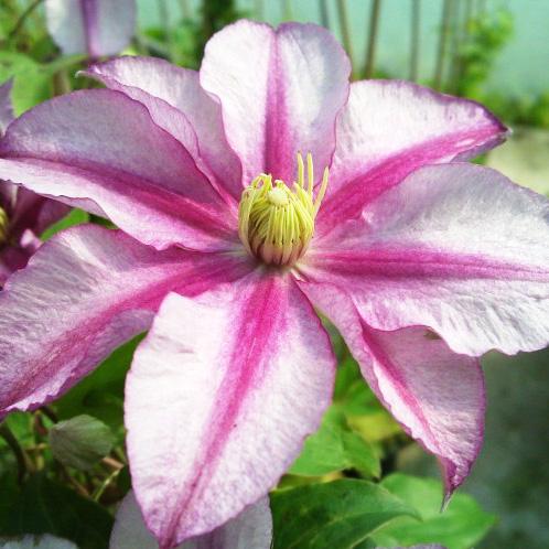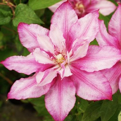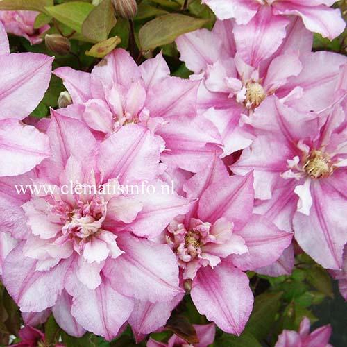 Клематис Lasting Love (Ластинг Лав) - польский сорт со светло-розовыми цветками с розово-красной полоской по середине лепестка, диаметром около 15 см. Высота 200-250 см. На прошлогодних побегах появляются полумахровые цветки. Тычинки с жёлтыми пыльниками на кремовых нитях. Цепляется за опоры листовыми черешками. Лучше цветёт и растёт на солнечных местах. Используется для выращивания у сеток, решёток и других садовых опор. Может плестись по натуральным опорам.