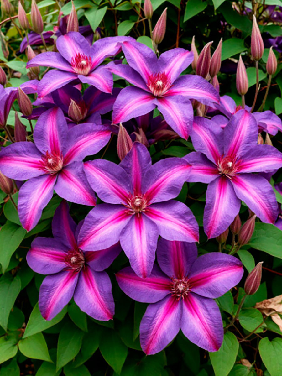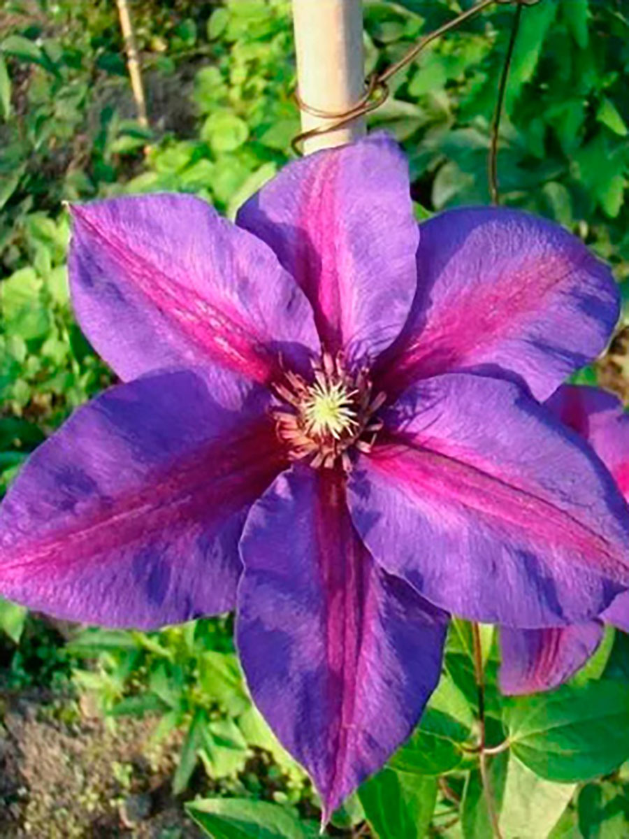 Клематис Mrs N. Thompson (Миссис Томпсон) лиана длиной до 2,5 метров. Цветки крупные до 14-16 см в диаметре. Окраска фиолетовая с красной полосой. Цветение обильное с мая по июнь, на побегах прошлого и текущего года.