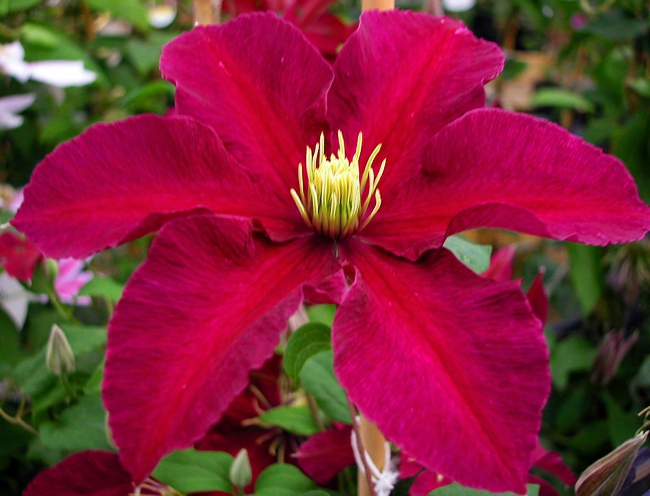 Клематис Niobe (Ниобе) гибридный крупноцветковый клематис, выведенный польским селекционером Владиславом Ноллом в 1975 году, относится к группе «Жакмана». Деревянистая лиана ростом до 2,5 метров пригодна для использования в качестве садового растения в большинстве климатических зон России, а также для выращивания в контейнерах и декорирования балконов, лоджий, двориков и открытых веранд. Клематис «Ниобе» хорошо подходит для выращивания в горшечной культуре на балконах или открытых верандах В средней полосе «Ниобе» цветет с июля по сентябрь на побегах текущего года. Бутоны появляются достаточно поздно и практически никогда не повреждаются возвратными заморозками. Цветки имеют диаметр 10-15 см (редко до 17 см). Каждый состоит из 4-6 бархатистых лепестков вытянуто-эллиптической формы, с острыми кончиками, «рифленой» полосой по центру, иногда с немного волнистыми краями. Окраска в начале цветения почти черная, у основной массы цветков – темно-пурпурная. Пыльники довольно короткие, ярко-желтые.