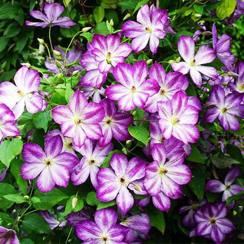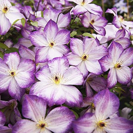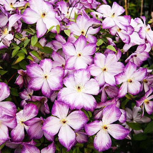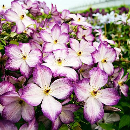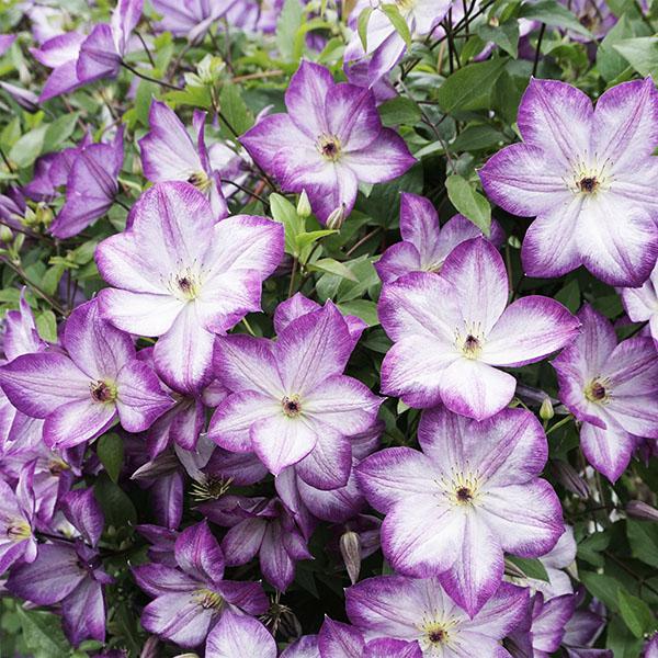 Клематис Pernille (Перниль) - потрясающе красивый, новый 'двухцветный' ломонос. Цветки среднего размера (6-9см) , бело-лиловые с пурпурными пыльниками. Долго и обильноцветущий, неприхотливый, надежный сорт. Цветет очень обильно с июня до сентября. Высота лианы до 2,5м. Растет быстро. Очень неприхотлив.Может расти на любой садовой почве, полностью морозостойкая. Для открытого грунта, а также для контейнеров, на балконах и террасах. Обрезка сильная.Сорта, причисляемые к Группе Viticella во время полного цветения удивляют обилием цветков. Эти сорта более здоровы, менее требовательны и долго декоративны, по сравнению с клематисами с крупными цветками, поэтому прекрасно подходят для городских посадок, начинающих садоводов