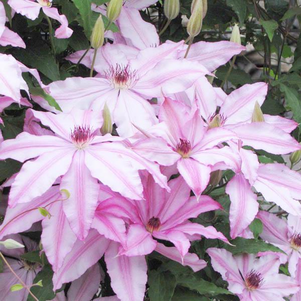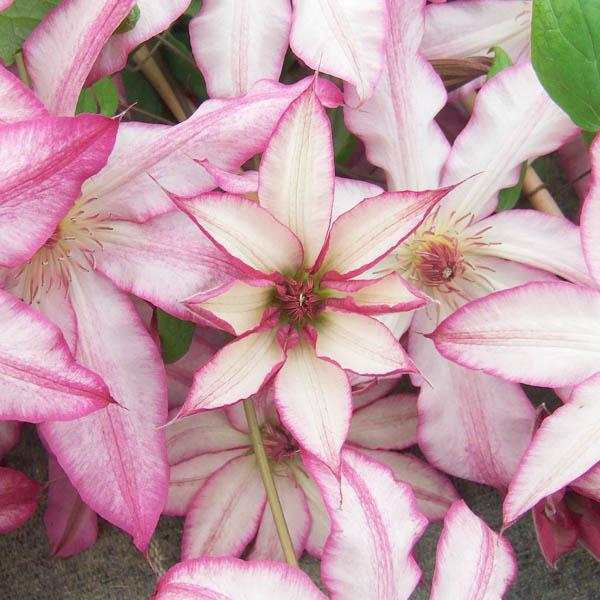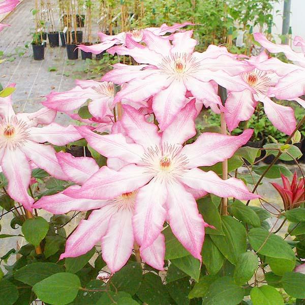 Японский сорт с цветами, состоящими из 8 белых, розоватых по краям, узко-эллиптических, остро законченных чашелистников, с неровными краями розово-красного цвета. Тычинки с нитками кремового цвета и пыльниками пурпурного цвета. Цветет вторично, но менее обильно. Цепляется за опоры черешками листьев. Можно высаживать у заборов, беседок, решёток, шестов и других садовых опор. Может карабкаться пo естественным опорaм, например, лиственным и хвойным не требующим подрезки. Любит светлые места. Особо хорошо смотрится на темном фоне. Хорошо растет в контейнерах.