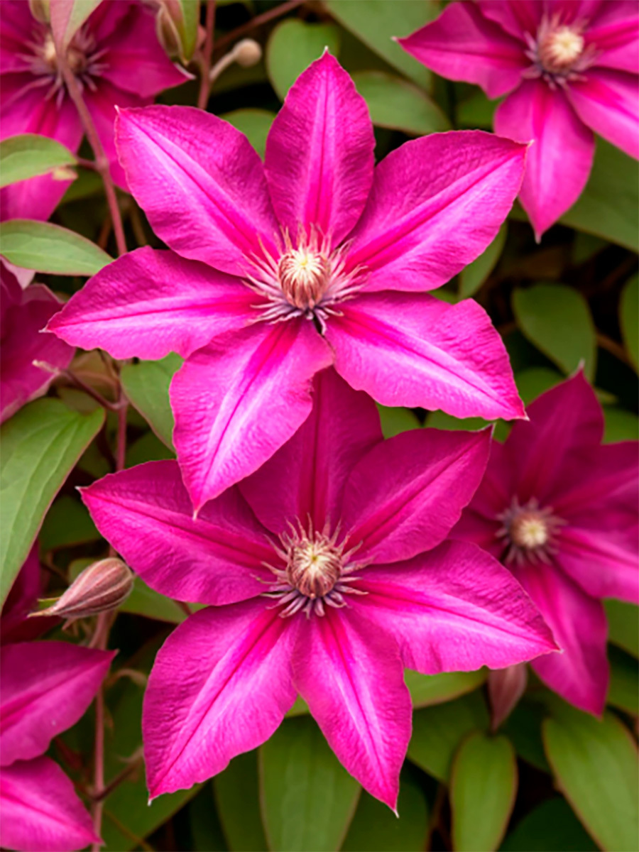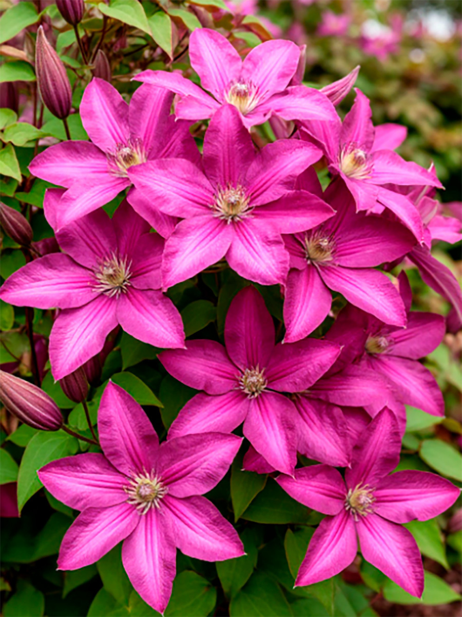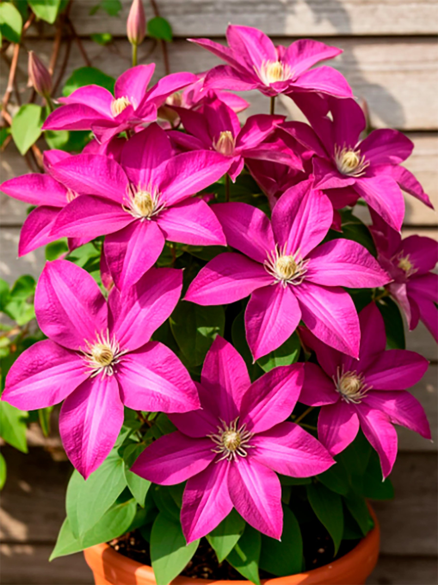 Клематис Vino (Вино) - крупноцветковый ранний сорт. Крупные цветки насыщено-розовые цветы с более темными продольными полосками. Пыльники бледно-желтые на белых или кремовых нитях. Диаметр цветка от 10 до 18 см., образует от 6-8 до 10 чашелистиков, лепестки налегающие друг на друга, с заостренными кончиками. Обильно цветет на побегах прошлого года с мая по июнь, а после обрезки повторное обильное цветение на побегах текущего года c августа по сентябрь. Высота лианы: 2-3 м. К условиям освещения нетребователен. Цепляется за опоры листовыми черешками. Особенно хорошо смотрится при выращивании у ограждений, решеток, сеток и других садовых опор. Может плестись по лиственным и хвойным кустарникам, а также полукустарникам.