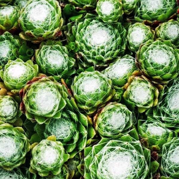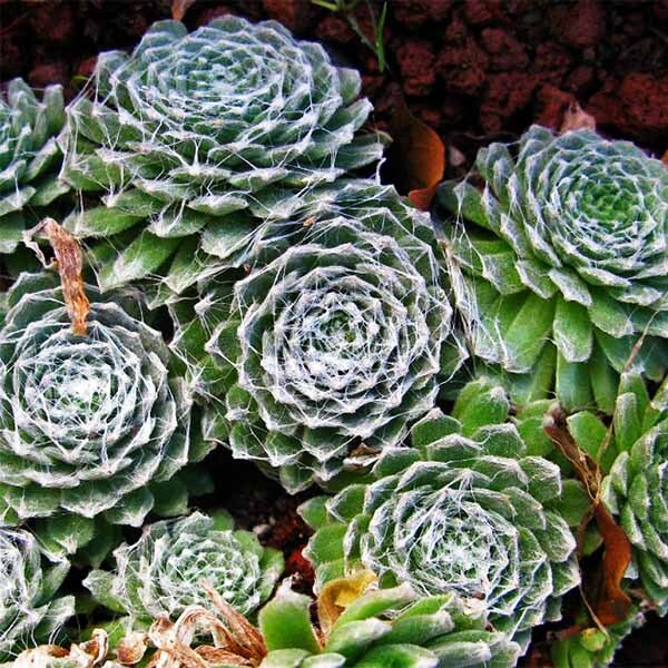 Один из самых красивых видов молодила. Всегда притягивает взгляды. Этот почвопокровник формирует многочисленные листовые розетки различных диаметров, словно выточенные из малахита лепестки, стелющиеся по земле. Их главная особенность - особая паутинная нитевая дымка, окутывающая все растение. В июне начинают высится необычные цветоносы, устремленные вверх. Они покрыты листвой по всей длине и увенчаны замысловатыми яркими соцветиями. Из молодила можно сделать неприхотливый суккулент, не требующий особого ухода, который будет потрясающе смотреться как в горшках и композициях, так и на улице, в расщелинах камней на альпийских горках.