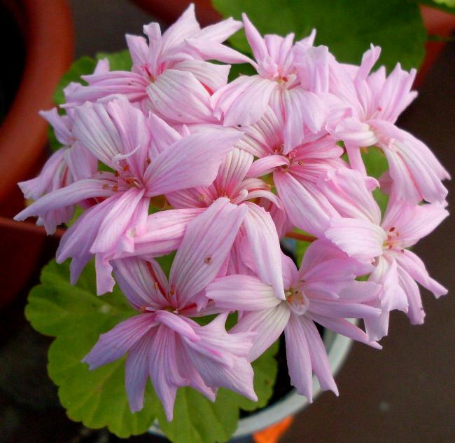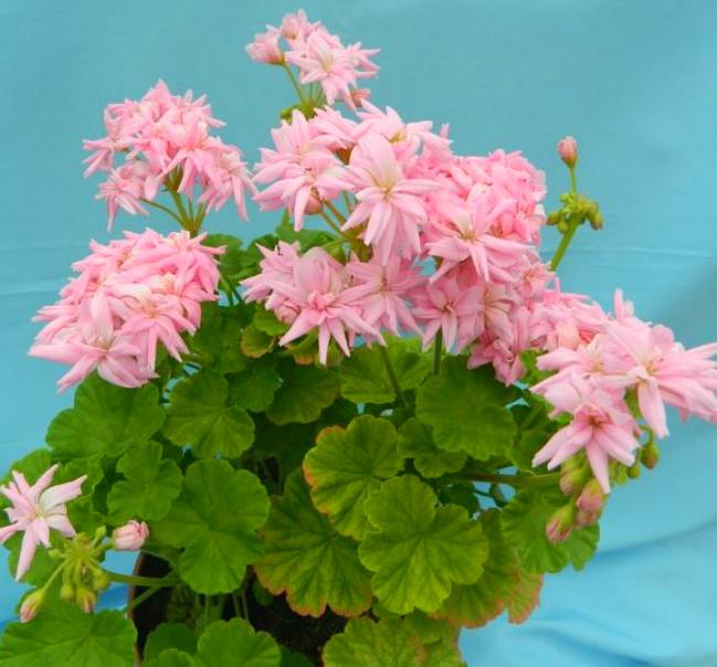 Карликовая зональная пеларгония с необычной формой цветка. Относиться к редкой группе кактусоцветных. Нежнейшей розовой расцветки цветы в форме звездочек!