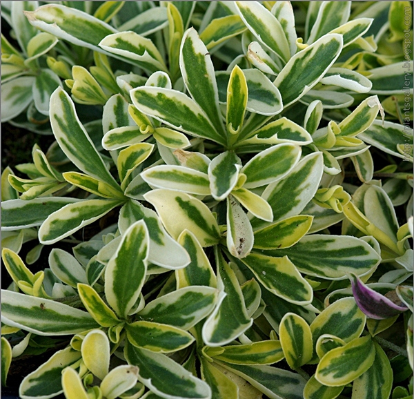 Полувечнозеленое многолетнее растение высотой 5 см и кустиком диаметром до 30 см. Очень ценится за обильное цветение в мае, цветки белые. В дополнение имеет светло-зеленые с белым окаймлением листья. Иногда встречаются формы с розоватым окаймлением. Широкие подушки из небольших розеток листьев очень эффектны. Растение морозостойко при условии хорошего дренажа.