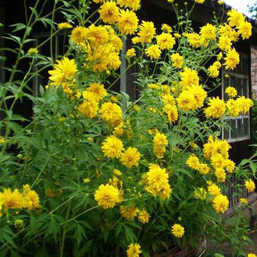 Неприхотливый многолетник. Куст высотой до 100 см. Листья зубчатые, светло-зеленые. Цветки махровые, крупные, яркие, золотисто-желтые. Цветет с июля по сентябрь.