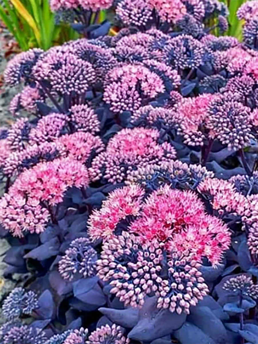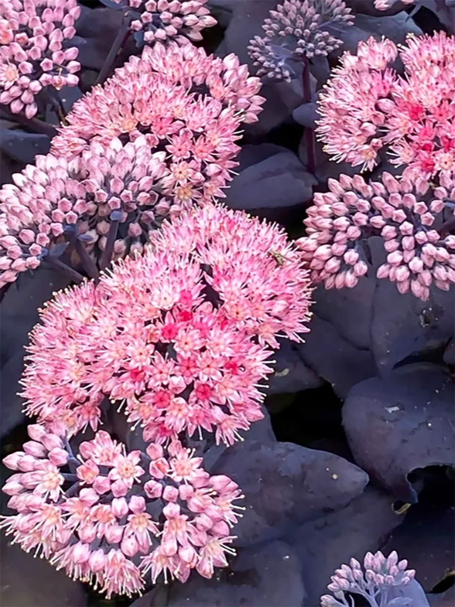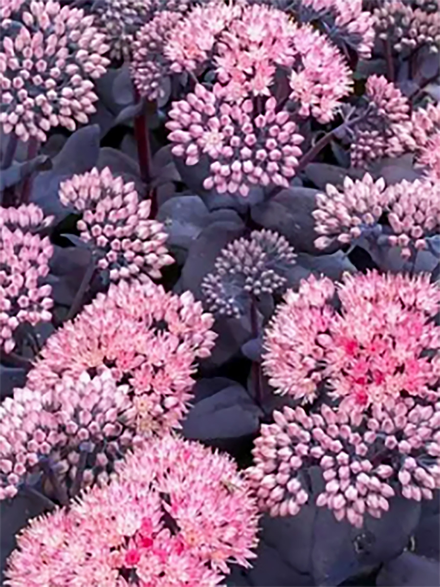 Гибридное многолетнее растение, которое отличается красивым внешним видом и неприхотливостью. Листья крупные, цвета баклажана с серебристым напылением на бордовых побегах. Меняют оттенки в зависимости от освещения: от голубовато-серо-дымчатых до иссиня-фиолетовых. Чем больше солнца попадает на листья, тем они темнее. Соцветия крупные, розового цвета с пурпурно-красными оттенками. Состоят из малоцветковых зонтиков на конце побега и в пазухах верхушечных листьев. Лёгкий аромат добавляет дополнительную привлекательность.