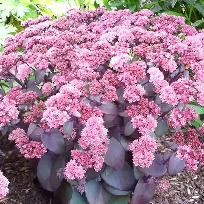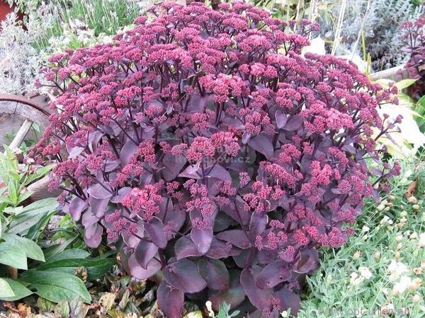 утолщенная пурпурно-сизая листва и темнеющие по мере раскрытия розовые цветы в щитках. Предпочитает богатые почвы и солнечное местоположение.