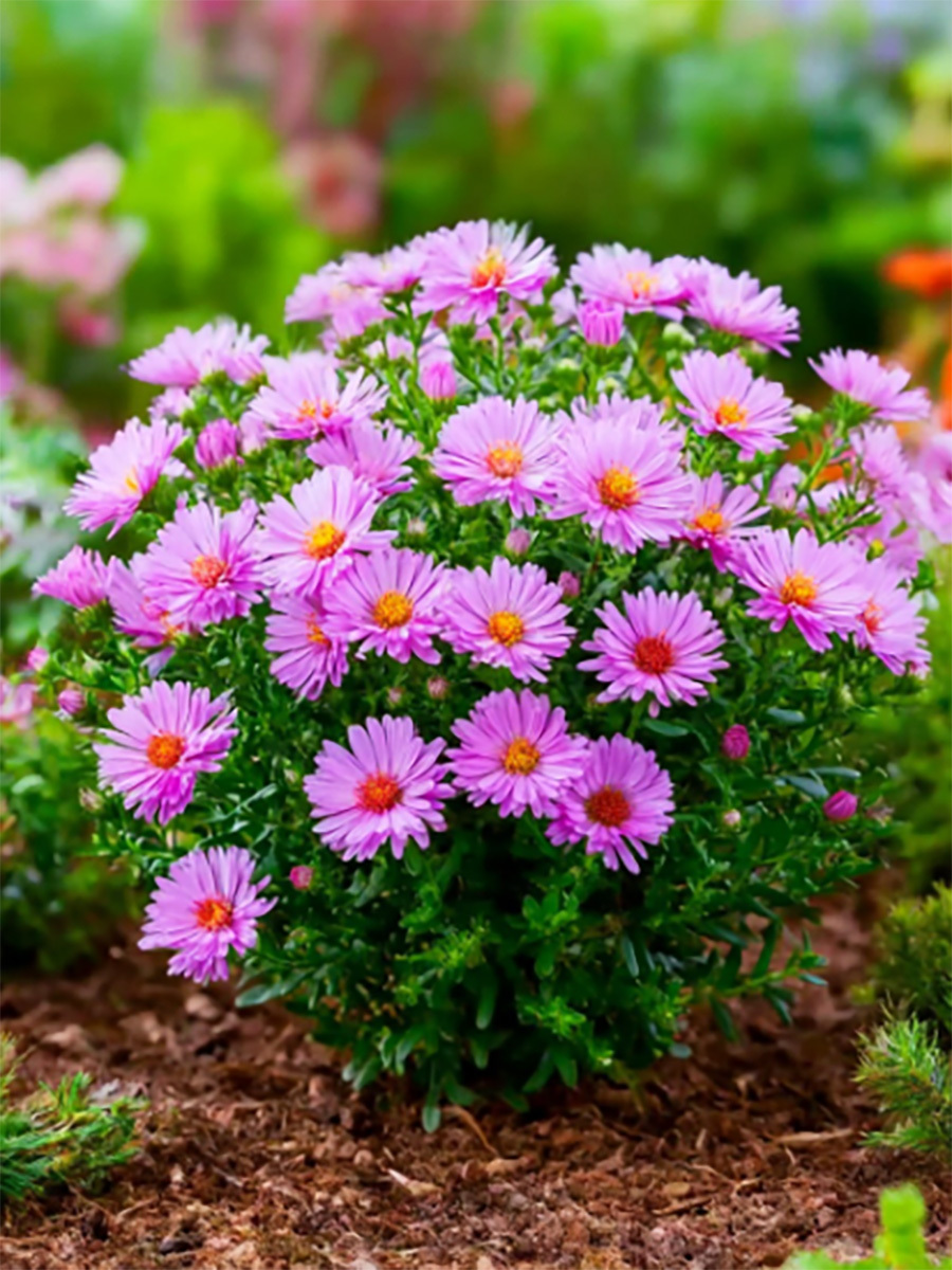 Посадка астры: Высокорослые экземпляры сажают на расстоянии 30-40 см друг от друга, интервал между среднерослыми сортами должен быть 20-25 см, а низкорослые астры сажают на расстоянии 10-15 см. При высаживании в лунки нужно следить, чтобы корни были расправлены и не перегибались, а точка роста не оказалась засыпанной землей. Землю вокруг посаженных кустиков хорошо уплотняют и поливают.