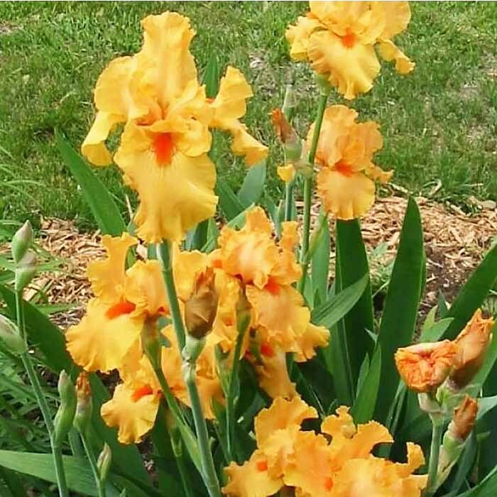 Яркий, крупный цветок, абрикосового цвета, с оранжевой бородкой и коричнево-оранжевыми фолами