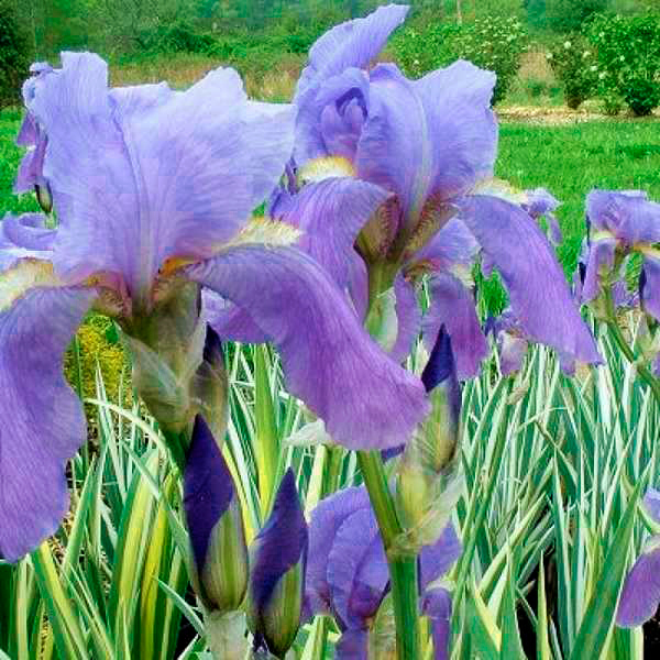 Невероятно декоративен и необычен за счет своей полосатой бело-зеленой листвы. Цветонос до 80 см высотой, в верхней части ветвящийся. Цветки крупные, почти сидячие, ароматные, нежно-голубые.