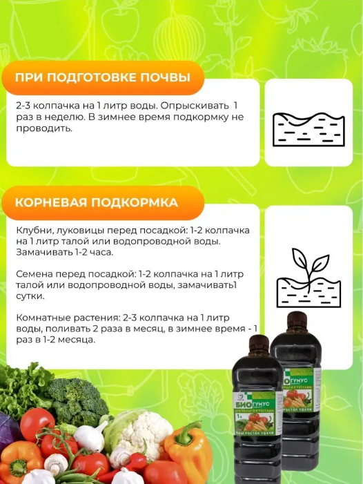 Биогумус жидкий - органическое удобрение для здорового роста и защиты растений! Химикаты и синтетические удобрения могут нанести вред не только растениям, но и окружающей среде. Но мы знаем, что ваше растение заслуживает только самого лучшего! Представляем вам Биогумус - инновационное средство для роста и защиты растений. Биогумус - это живой концентрат, созданный природой самим. Он содержит все необходимые микроэлементы и питательные вещества, которые растение получает из почвы. Биогумус стимулирует рост корней, укрепляет стебли, повышает иммунитет растений и защищает их от вредителей. Одним из основных преимуществ Биогумуса является его универсальность. Он подходит для всех видов растений: от комнатных цветов до овощей, таких как томаты и перцы. Биогумус поможет вашей рассаде стать сильной и здоровой, а затем превратится в пышный цветок или вкусный овощ. Биогумус - это не просто удобрение, это сила жизни для вашего растения. Его гуминовые кислоты и микроэлементы позволяют растению полноценно развиваться и обогащают почву жизненной энергией. Одним из ключевых компонентов Биогумуса является вермикомпост - продукт переработки навоза калифорнийскими червями. Вермикомпост богат полезными бактериями и гуминовыми кислотами, которые стимулируют рост растений и повышают их устойчивость к болезням. Фитофтора и другие грибковые инфекции больше не будут причинять вред вашим растениям! Биогумус жидкий Растения 1л содержит специальные регуляторы роста, которые эффективно борются с вредителями и защищают растения от заболеваний. Применение Биогумуса очень простое. Достаточно развести небольшое количество концентрата в воде и полить растение. Он быстро впитывается корневой системой и начинает свою полезную работу. Закажите Биогумус прямо сейчас и дарите своим растениям здоровый рост и защиту. Не ждите, пока ваши растения заболеют или будут атакованы вредителями. Позаботьтесь о них заранее с помощью Биогумуса!