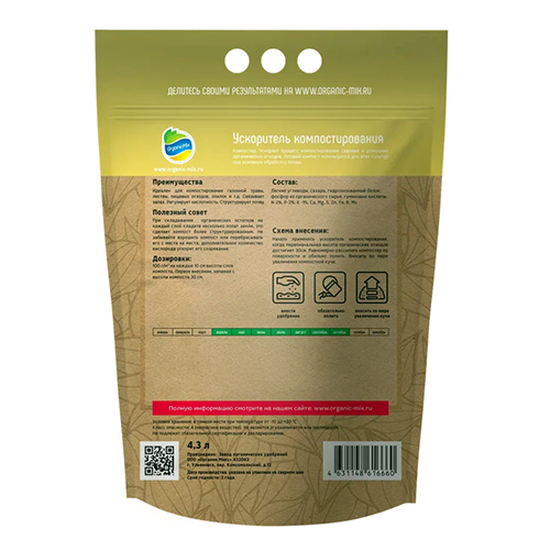 Схема внесения: 100 г/м2 на каждые 10 см высоты слоя компоста. Первое внесение, начиная с высоты компоста 30 см.