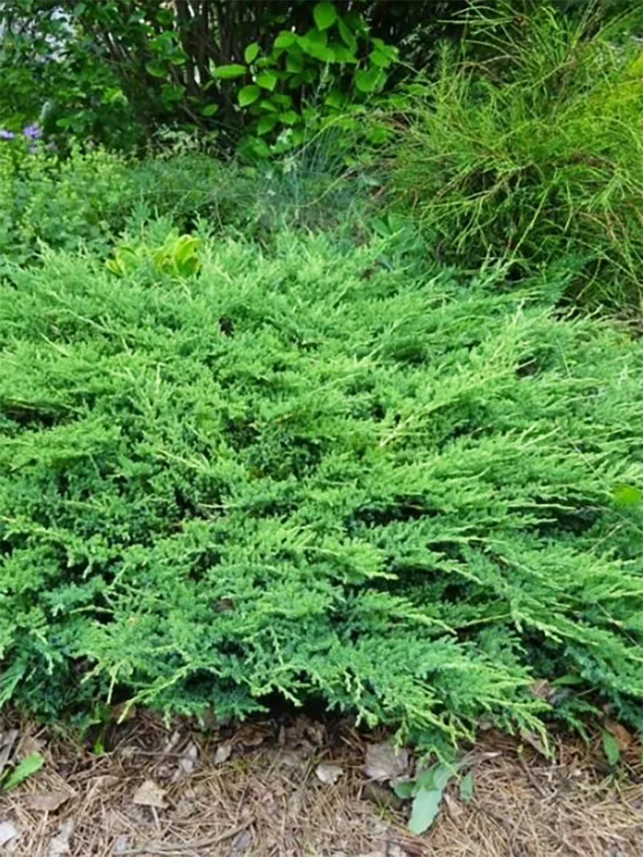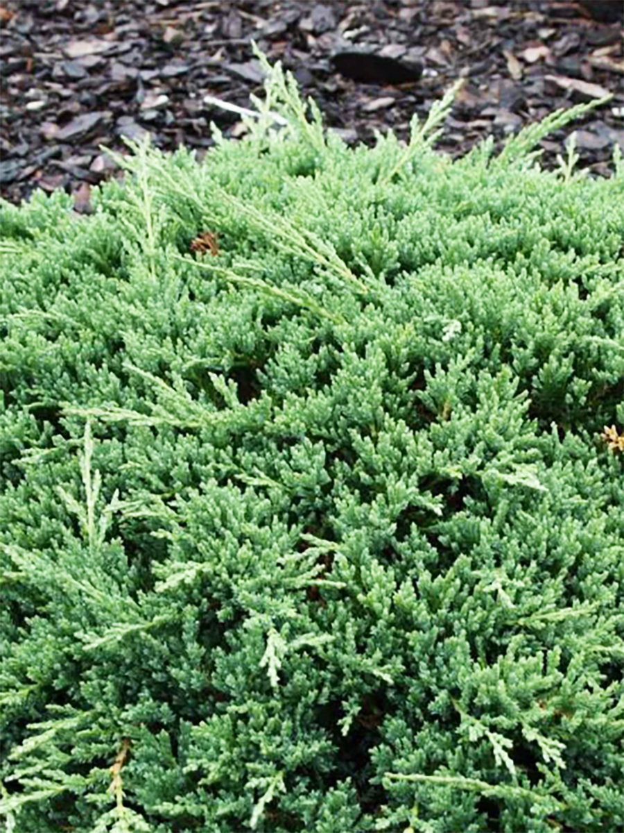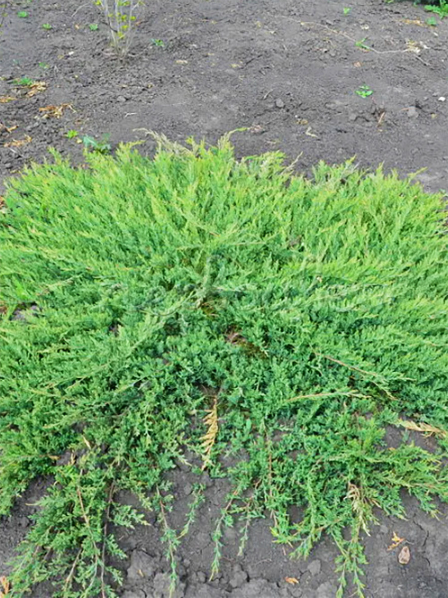 Кустарник высотой 0,15 м, диаметр кроны 2,5 м. Форма стелющаяся, декоративная. Кора серо-бурая. Хвоя чешуйчатая, густая, голубая, зимой рыжеватая. Растет медленно. Долговечен. Применение: одиночные и групповые посадки на каменистых горках. Используется и как почвопокровное растение (при схемы посадки 2-3 экземпляра на 1 м2). Можжевельник лучше высаживать на солнечных местах, допускается небольшое затенение. Расстояние между высаживаемыми растениями от 0,5 до 2 м. в зависимости от размера. Посадочная яма должна быть в раза 2-3 больше земляного кома и глубиной, для взрослых растений до 70 см. На дне ямы делают дренажный слой из песка или битого кирпича толщиной около 20 см. При посадке важно чтобы корневая шейка не была заглублена. Морозостоек.