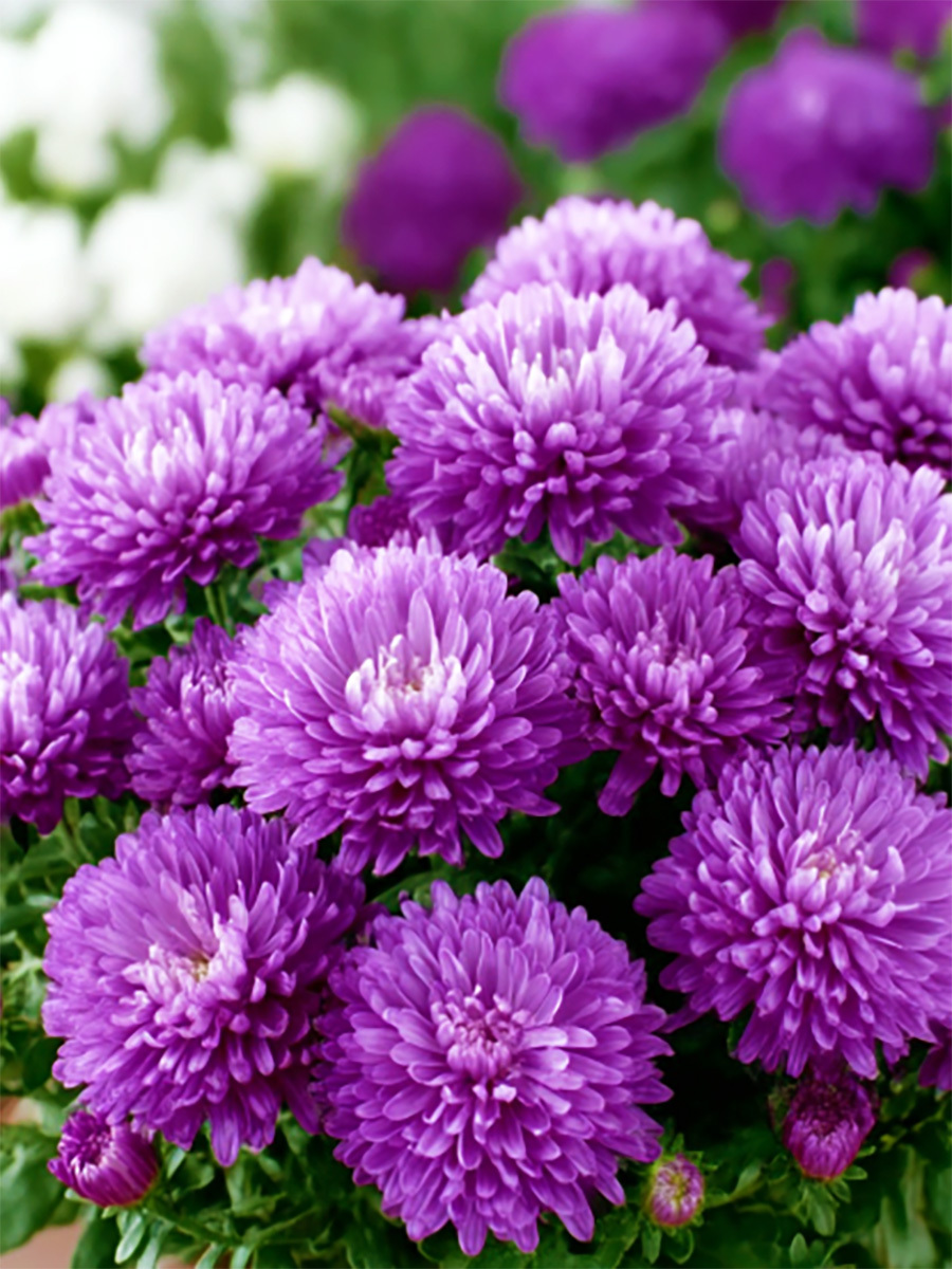 Посадка астры: Высокорослые экземпляры сажают на расстоянии 30-40 см друг от друга, интервал между среднерослыми сортами должен быть 20-25 см, а низкорослые астры сажают на расстоянии 10-15 см. При высаживании в лунки нужно следить, чтобы корни были расправлены и не перегибались, а точка роста не оказалась засыпанной землей. Землю вокруг посаженных кустиков хорошо уплотняют и поливают.