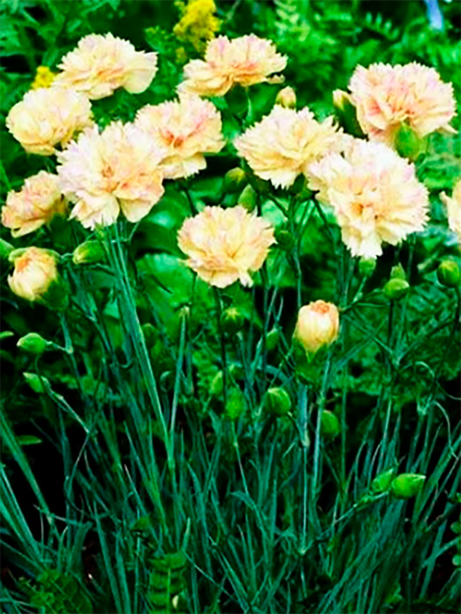 Сорт имеет необычную окраску. Махровые цветки невероятно нежные - кремово-желтые с бледно-розовым румянцем и полосками. Цветки расположены на верхушках прочных стеблей над игольчатой подушкой сизо-зеленых листьев.