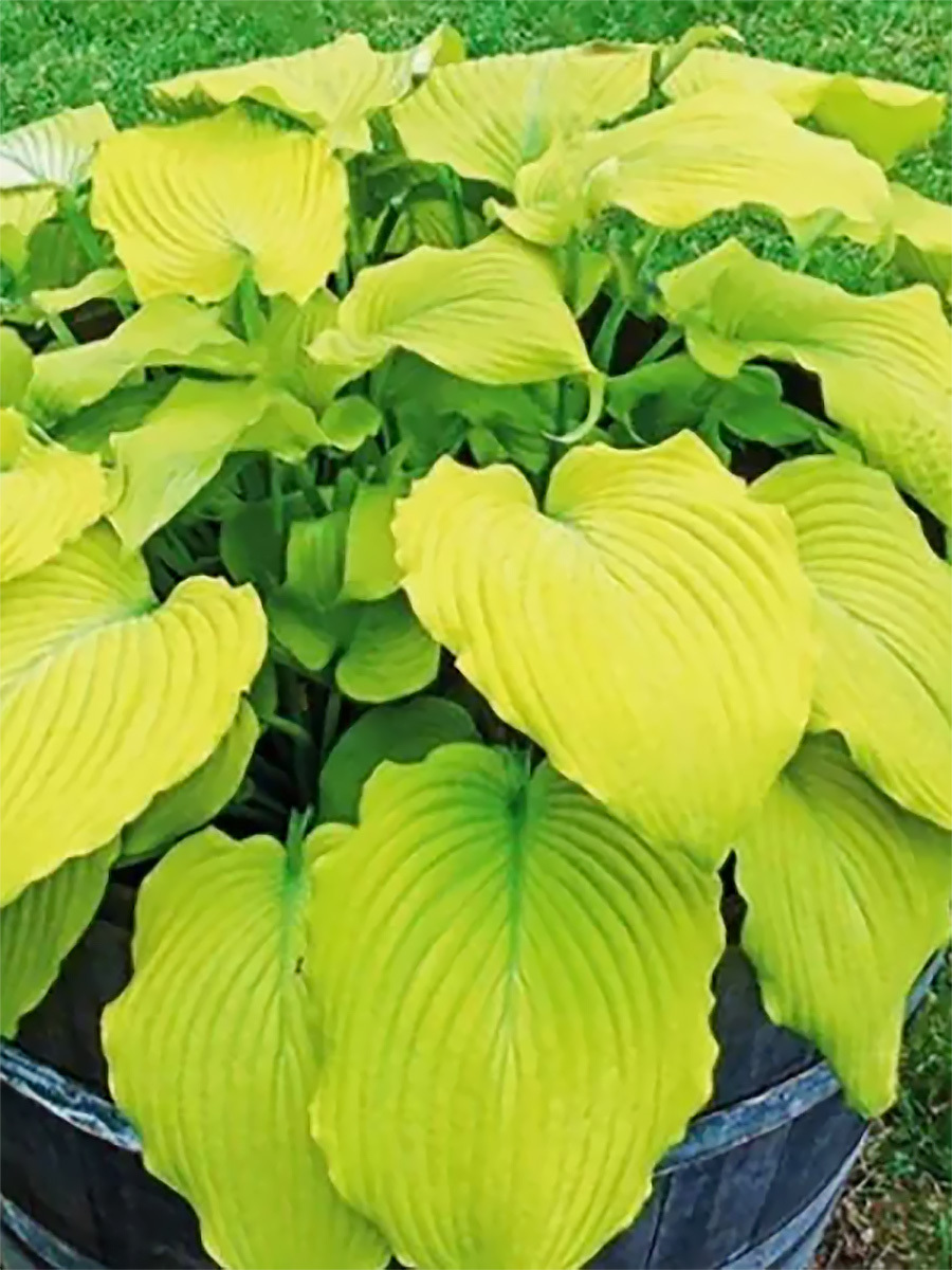 Декоративный многолетник с яркой окраской листьев. Название сорта связано с сочетанием оттенков лайма и банана. Листья сердцевидные, плотные, с глубокими рельефными прожилками. На однородном фоне пластины хорошо заметны, что усиливает их фактуру. Цветение приходится на середину летнего сезона. Крупные цветоносы усыпаны колокольчиковидными цветами нежно-лавандового оттенка. Компактный куст: высота — до 40 см, ширина — до 60 см.