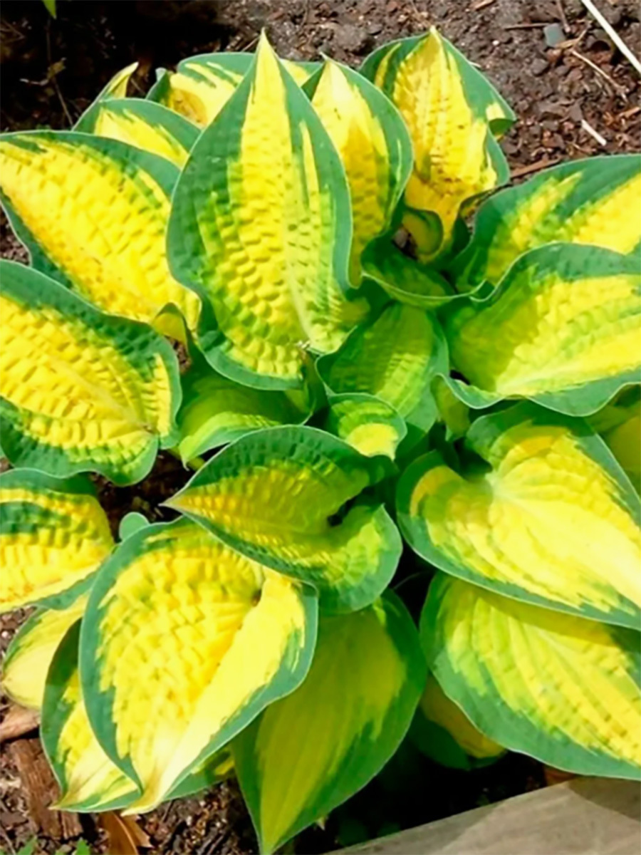 Красивое растение с динамичной изменчивой окраской листвы.Весной листья раскрываются светло-жёлтыми, затем постепенно теплеют, переходя в мягкие оранжево-золотистые оттенки. По краю проходит широкая зелёная или синевато-зелёная кайма, которая подчёркивает яркий центр. Листья плотные, слегка волнистые, хорошо держат форму. Со временем куст становится крупным, широким и заметным. Высота куста около 40–55 см. Ширина: 70–90 см.