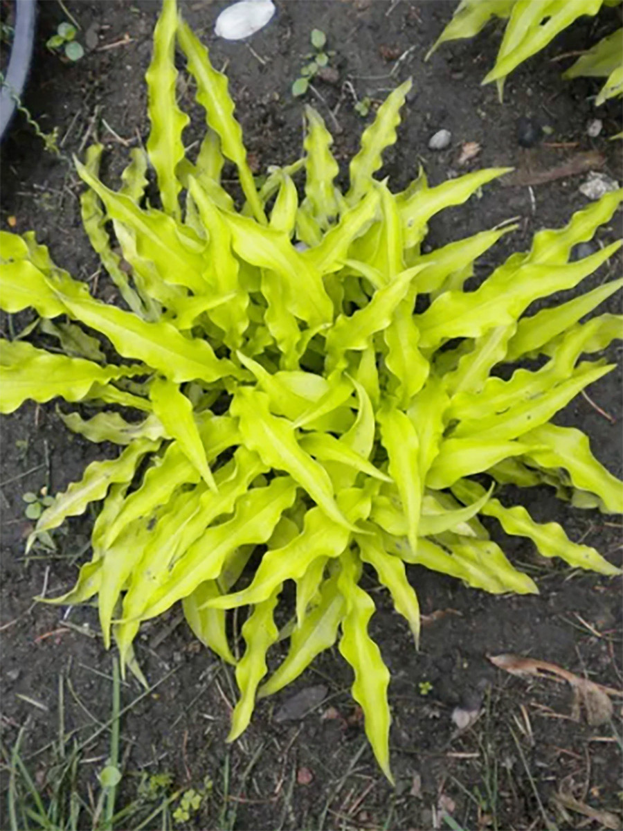 Хоста Уиглз энд Скуиглз. Высота от 20 до 25 см, ширина 60-80 см. Куст низкий, широкий. Хорошо держит форму. Небольшая хоста с ярко-желтыми, узкими, очень длинными листьями. Отличаются невероятно волнистыми краями. Лист в длину 15 см, в ширину 5 см. Эта хоста относится к быстрорастущим и средне-быстрорастущим многолетникам. Этому многолетнику нужно немного солнца, чтобы раскрыть свои цвета во всей красе. В большей тени листья будут более зеленовато-зелеными: для лучшего желтого цвета сажайте на участке с утренним солнцем и дневной тенью. Цветы лавандовые.