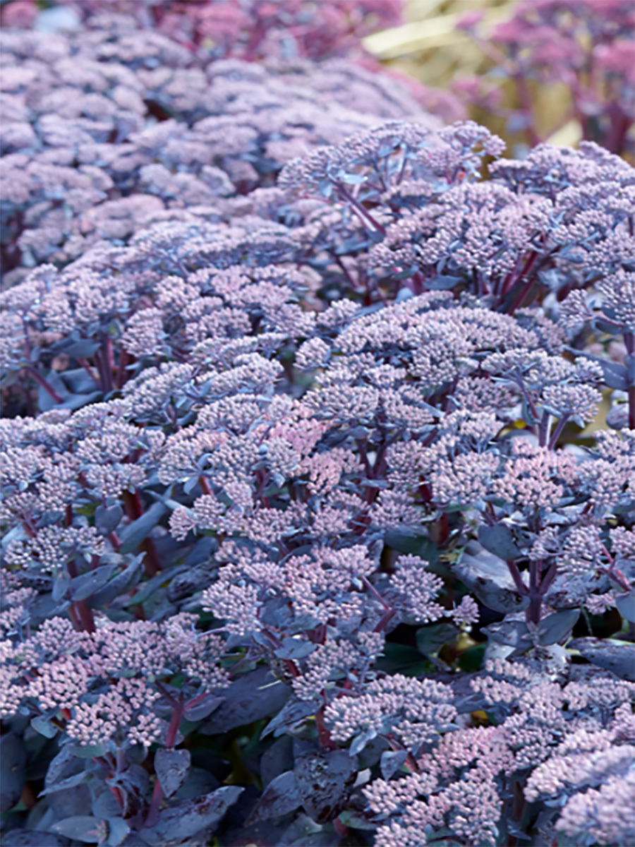 Гибридное многолетнее растение, которое отличается красивым внешним видом и неприхотливостью. Листья крупные, цвета баклажана с серебристым напылением на бордовых побегах. Меняют оттенки в зависимости от освещения: от голубовато-серо-дымчатых до иссиня-фиолетовых. Чем больше солнца попадает на листья, тем они темнее. Соцветия крупные, розового цвета с пурпурно-красными оттенками. Состоят из малоцветковых зонтиков на конце побега и в пазухах верхушечных листьев. Лёгкий аромат добавляет дополнительную привлекательность.