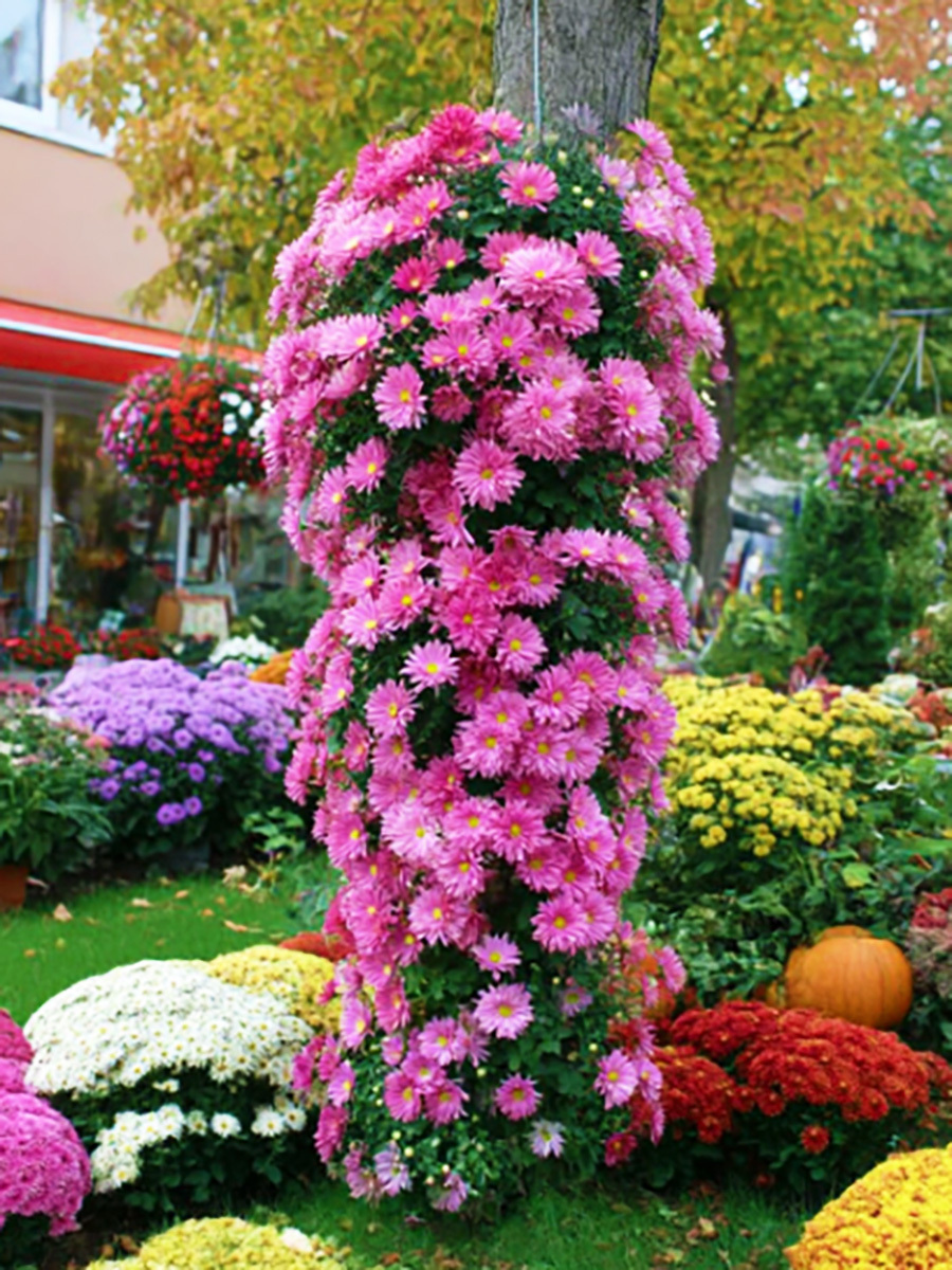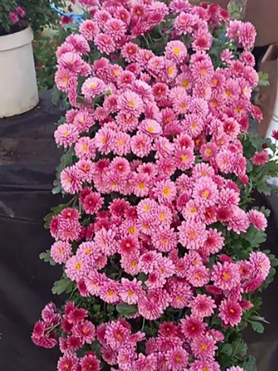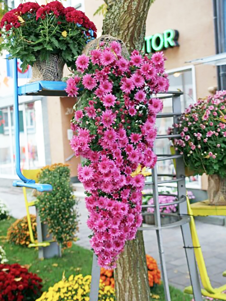 Сорт каскадной (ампельной) хризантемы. Выведен для создания каскадных композиций — кустов, стебли которых растут не вертикально вверх, а свисают вниз под любым углом хризантема. Длина стеблей составляет 1-1,5 м. Куст плотный, обильноцветущий. Цветки полумахровые, крупные (около 6 см в диаметре), с лепестками розового цвета. Цветение — конец сентября — начало октября. Для композиции потребуются специальные опоры или каркасы разнообразной формы, к которым фиксируют побеги.