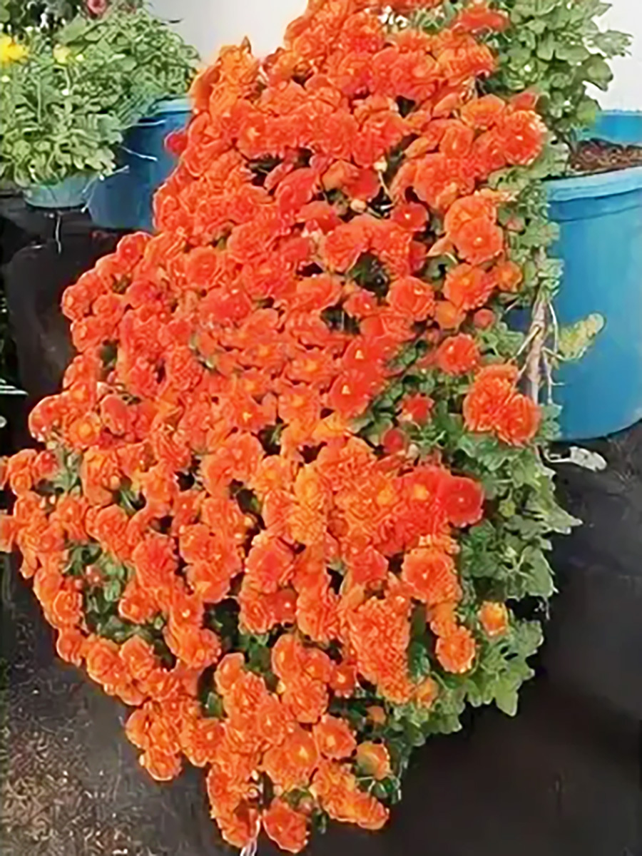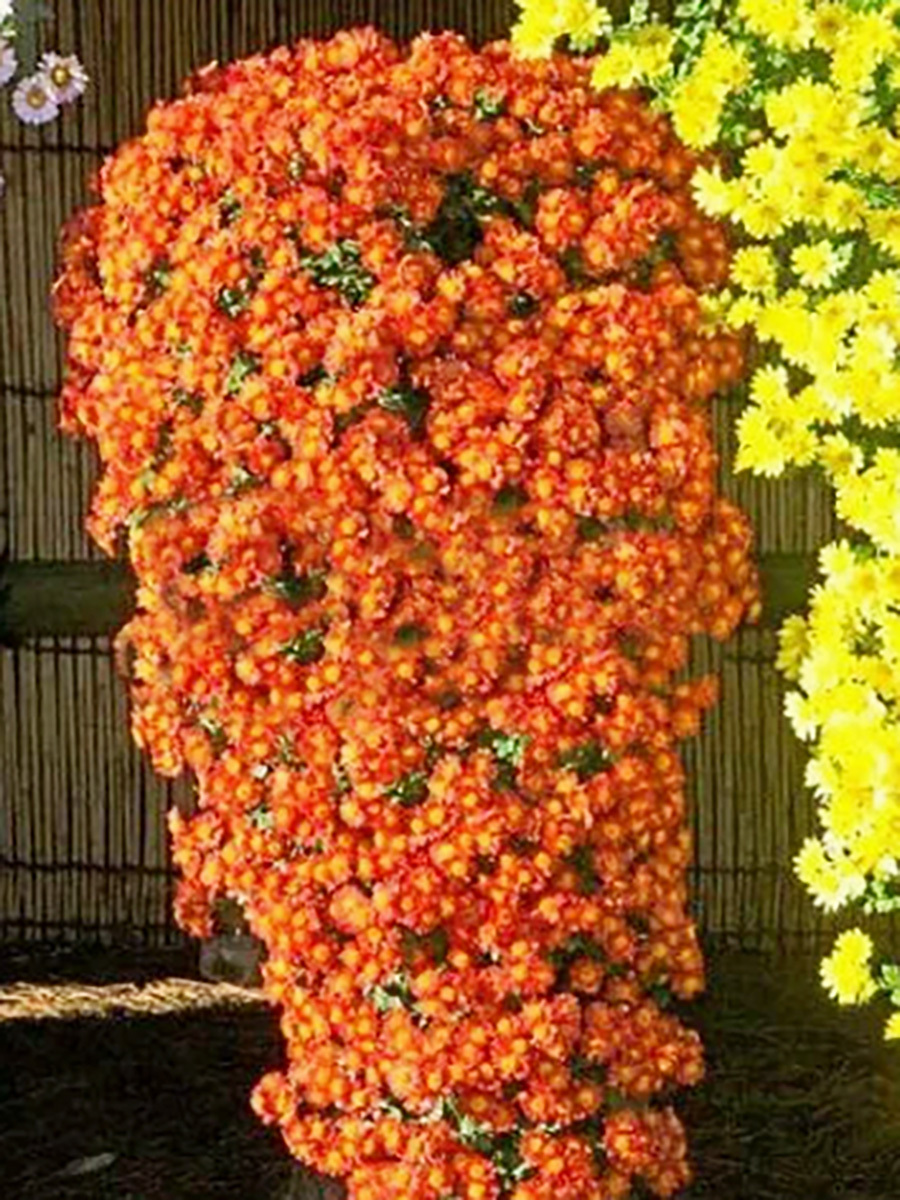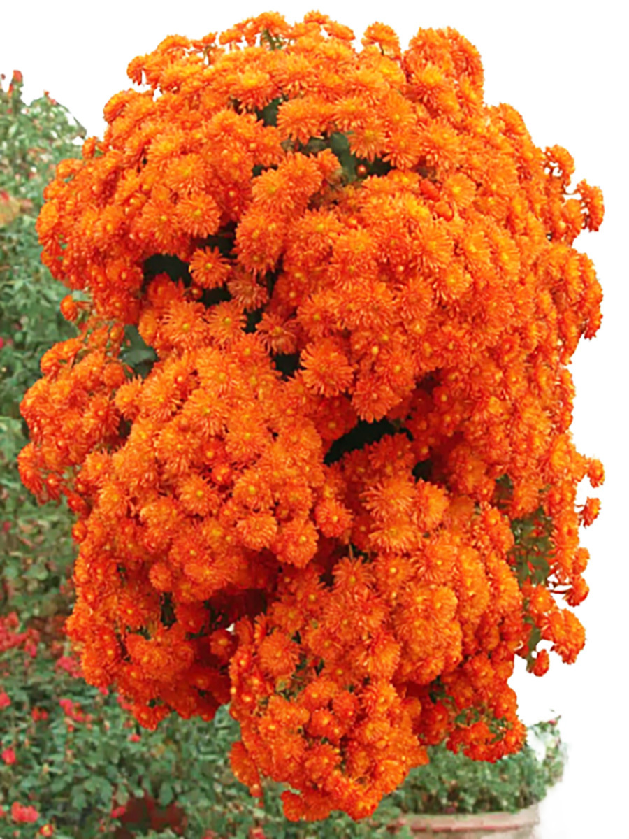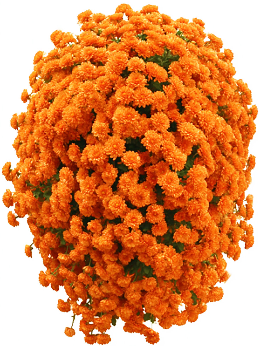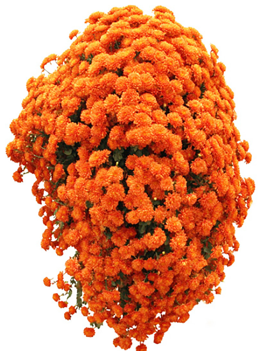 Сорт с длинными, спускающимися вниз гибкими побегами и многочисленными махровыми соцветиями ярко-оранжевого окраса. Чтобы получить каскадный вариант, стебли направляют вниз под любым углом, соответствующим дизайнерской идее. Если не использовать приём каскадного формирования, стебли растут вверх, и куст не будет отличаться от обычных хризантем.